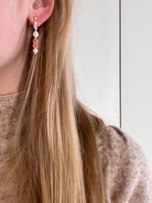 Fijne lange oorbel met wit/ parelmoer parel en goud roze details