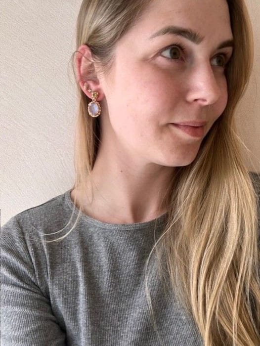 Kleine oorbellen in beige/peach met grote en kleine steentjes.